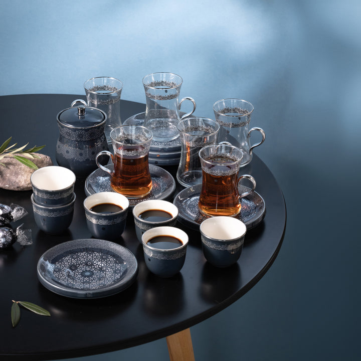 طقم مكون من 6 استكانات شاي و 6 صحون و 6 فناجين قهوة عربية وسكرية. الحجم : 150 مل + 50 مل اللون : أزرق وفضي المادة: بورسلان + زجاج